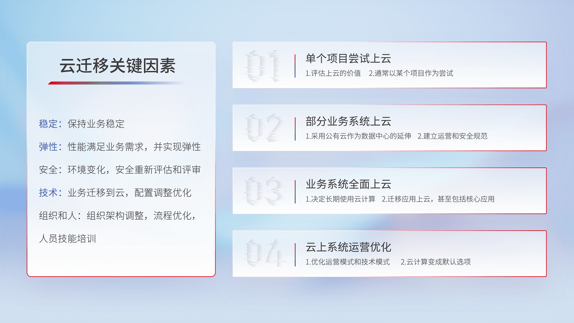 结合实际业务,,从规划设计、、、云平台选型、、、云原生改造、、数据迁移、、、集成交付,,,迁移全过程为客户识别最佳上云路径,,做好风险识别管理,,,设计网络架构、、、身份权限、、、安全审计合规、、操作审计、、、日志审计、、监控告警策略、、、、多站点容灾设计等,,,对云上基础设施进行整体规划,,提升IT治理水平,,以满足弹性、、、高可用、、高性能的需求。。。