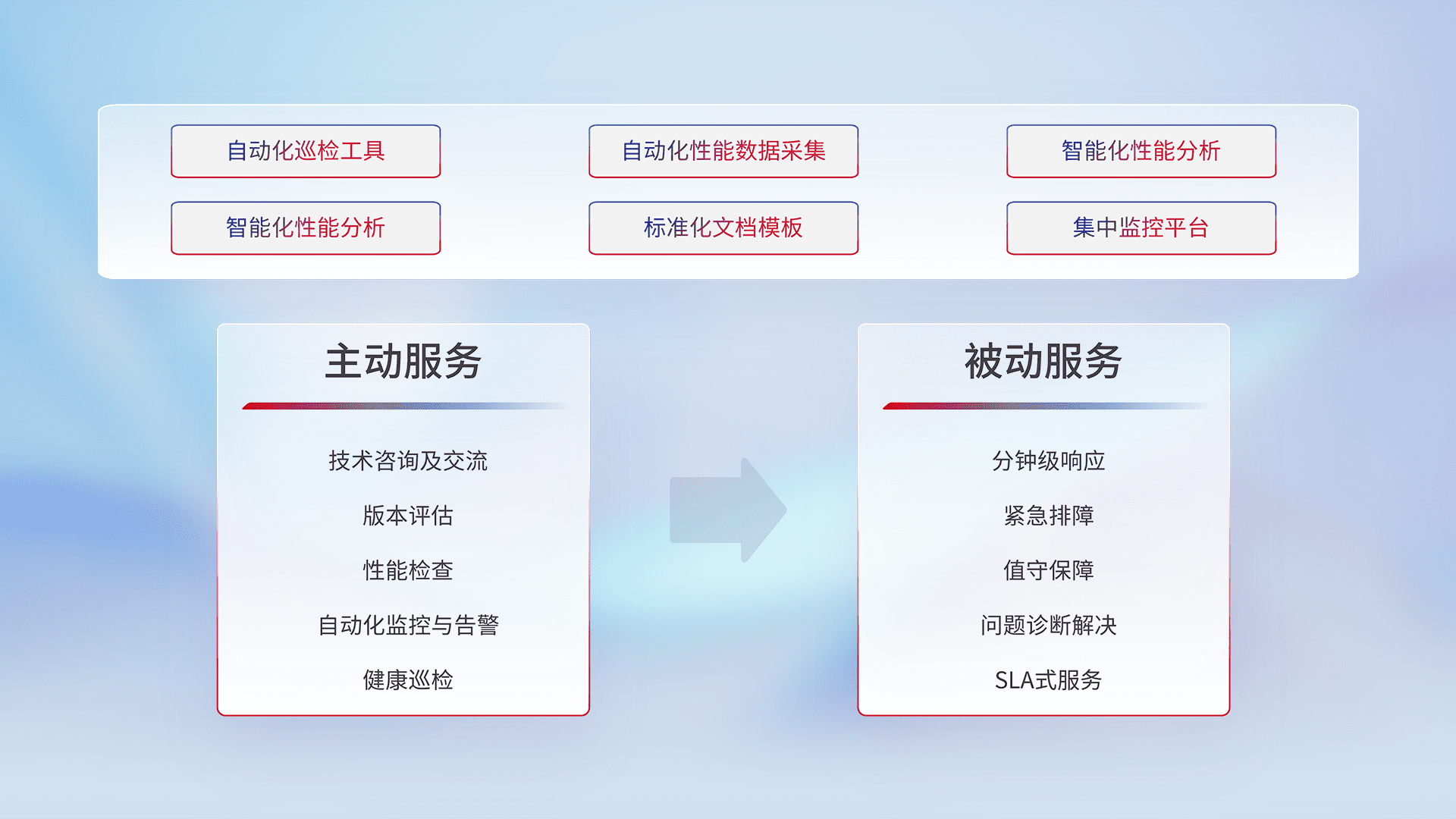 智能化工具和标准化文档,,,,保障服务质量,,提供主动服务(包含技术咨询、、、、版本评估、、、性能检查、、、、自动化监控与告警、、健康巡检)和被动服务包含(分钟级响应、、紧急排障、、、、值守保障、、、问题诊断解决、、、SLA服务)。。。
